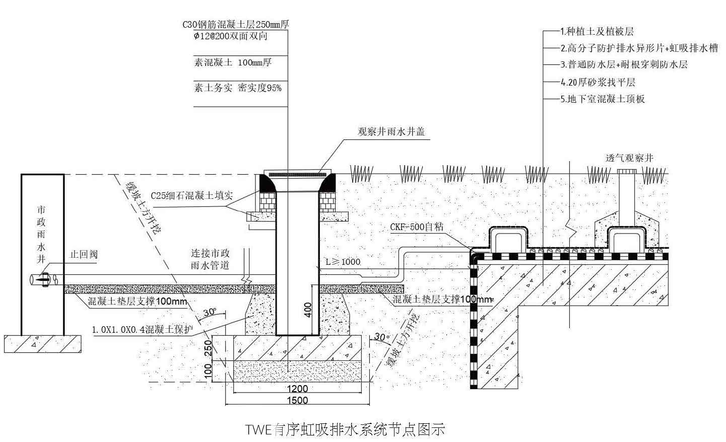 4、經觀察井沉淀,排入有序虹吸排水系統,待晴天需要對綠化植物進行澆灌時再對雨水進行循環利用,從以往的被動排水轉變成了現在的主動式排水,從而真正實現了零坡度、有組織排水。