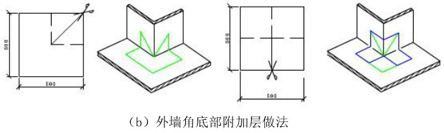 1、陰陽角附加層做法如下,附加層總寬度為500mm,每側250mm。