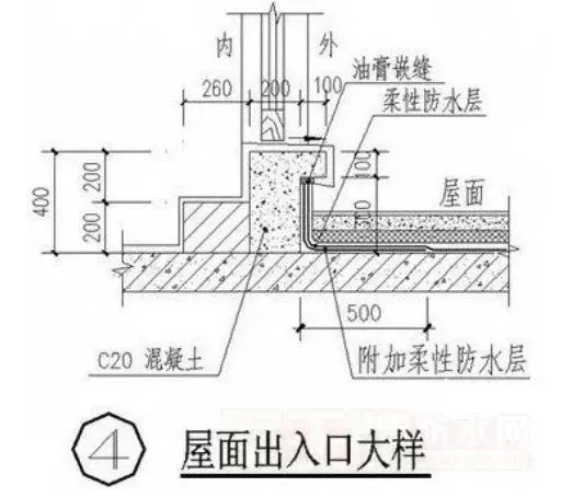 屋面出進口因使用頻繁會組成提早粉碎,出進口處防水層收頭應處置妥貼,除外,應適當作加強層,并要求外觀作防水層,如水泥沙漿防水層等。
