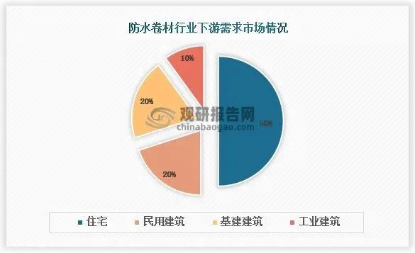 根據(jù)觀研報告網(wǎng)發(fā)布的《中國防水卷材行業(yè)發(fā)展趨勢分析與未來投資預(yù)測報告(2023-2030年)》顯示,我國防水卷材市場客戶所屬行業(yè)分布與行業(yè)對防水需求的水平強相關(guān)。防水卷材的彈性和耐候性好,但拼接工藝難度高,細部處理復(fù)雜,因此并不適合家庭防水的小面積施工,普遍適用于屋面、地下室、廚衛(wèi)、外墻等大面積施工,目前住宅是防水卷材市場最主要的方向。防水卷材在住宅領(lǐng)域的客戶占比達到50%,其次民用、基建領(lǐng)域主要用于高速公路和高速鐵路的橋梁、隧道、城市道路橋梁、地下管廊和地下空間等市政工程,地下鐵道等交通工程,引水渠、水庫、壩體、水利發(fā)電站及水處理等水利工程,這類客戶數(shù)量占比達到40%,工業(yè)領(lǐng)域的客戶數(shù)量占比達到10%。