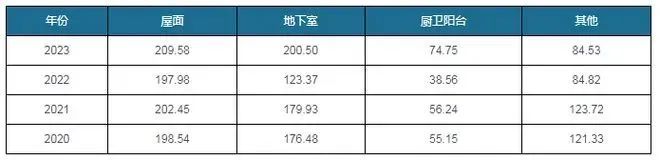 具體來看,當前防水新規(guī)帶來的增量主要在房建領(lǐng)域,在不考慮房地產(chǎn)開工端和竣工端修復(fù)的情況下,以過去三年的數(shù)字進行推算,假設(shè)2023年全年按照新規(guī)實施,2023年屋面、地下室、廚衛(wèi)陽臺防水空間分別為209.58億元、200.50億元、74.75億元,房建領(lǐng)域防水材料市場空間將達到569.36億元,增幅高達48%。