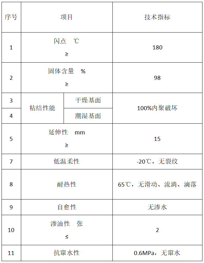 (5)耐溫、耐侯性:非固化防水膠的耐低溫性能可達到-20℃ 以下,耐高溫性能可根據(jù)不同工程的需要制作成40—90℃ 之間的任何一個高溫指標。